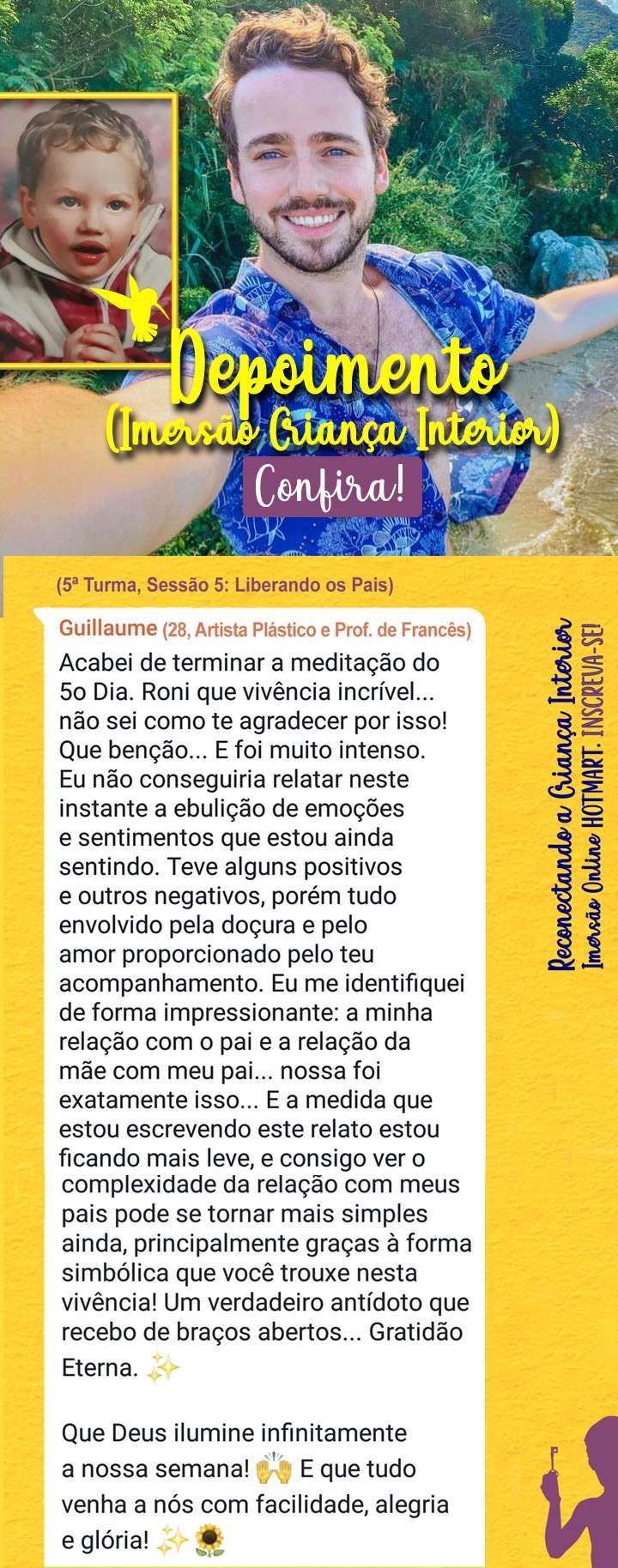 Mais do que uma simples introdução ao curso, recursos para você criar algo determinante no êxito de qualquer processo terapêutico: segurança e confiança. Você vai conhecer e entender não só a formação acadêmica e um pouco das experiências do Roni Diniz, mas vai ter acesso ao cerne da missão e chamado que me fez criar e insistir e disponibilizar esta imersão, do fundo do meu coração, a partir da pureza e cura da minha própria criança interior, o Roninho, um menino órfão e prodigioso que me ensina dia a dia a respeitar a dor alheia, como aprendi a respeitar e estudar aminha e a ser um adulto comprometido socialmente (de pés bem aterrados ao chão) com a arte, com a espiritualidade sem rótulos religiosos, com o meio ambiente, mas principalmente com a Criança Interior e sua autenticidade e criatividade